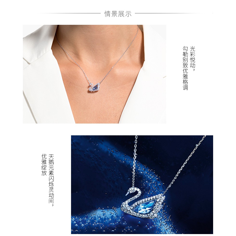 As a symbol of graceful elegance and nobility, the swan is the ideal icon for swarovski jewelry... Swarovski crystal 125th anniversary dancing swan necklace, blue, rhodium plated 5533397. 1.7 cm x 1.2 cm. This beautiful necklace condenses over 125 years of artisanal and designing experience into a beautiful swan set with numerous sparkling swarovski stones.